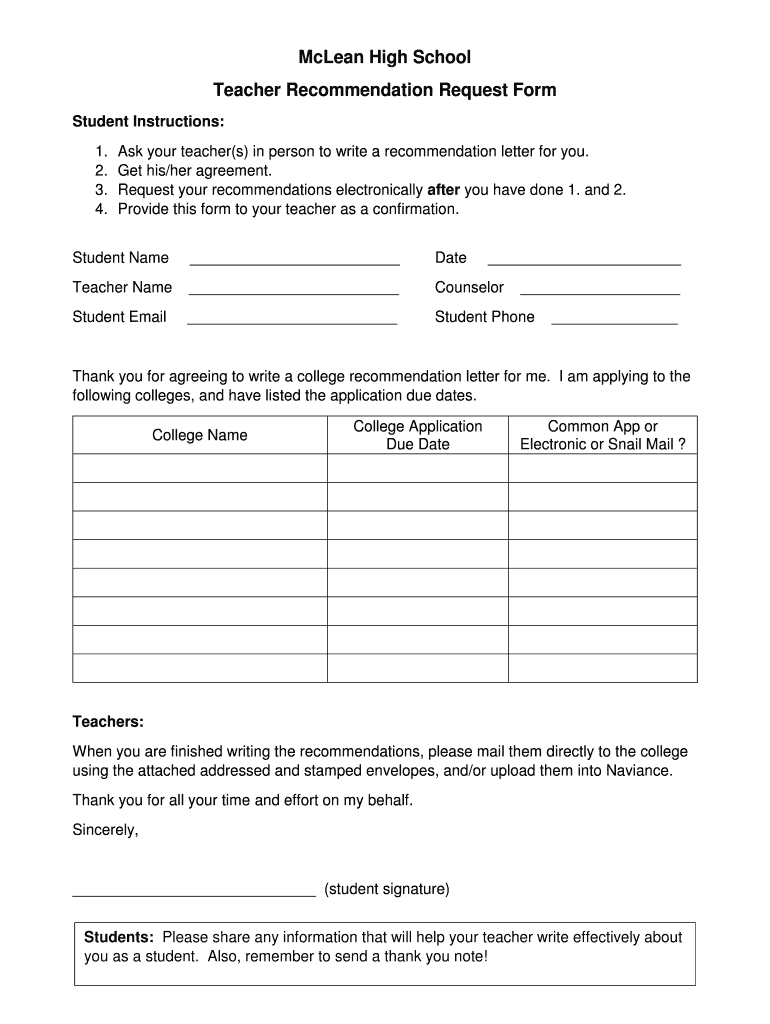 McLean High School Teacher Recommendation Request Form Student Instructions: 1. 2. 3. 4. Ask your teacher(s) in person to write a recommendation letter for you. Get his/her agreement. Request your
