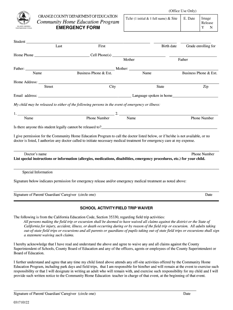 (Office Use Only) ORANGE COUNTY DEPARTMENT OF EDUCATION Community Home Education Program TCR (1 initial & 1 full name) & Site E. Date EMERGENCY FORM Student Last First Birth date Home Phone Cell Phone(s)