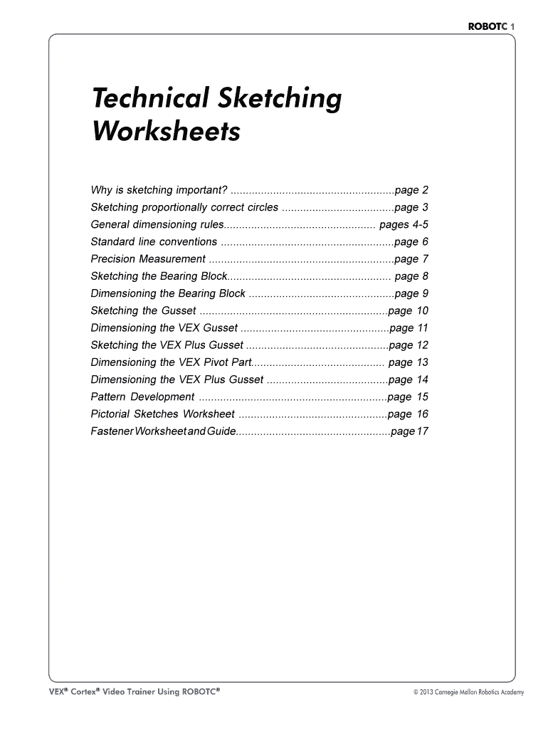 Created by the Carnegie Mellon Robotics Academy in partnership with the VEX® Cortex® Video Trainer, these worksheets serve as valuable resources for honing technical drawing skills. Students and professionals alike can benefit from structured practices designed to improve their abilities in engineering sketching exercises.