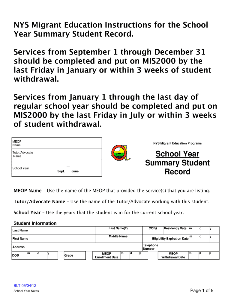 Key Features of the NYS Migrant Education Programs Student Record Form