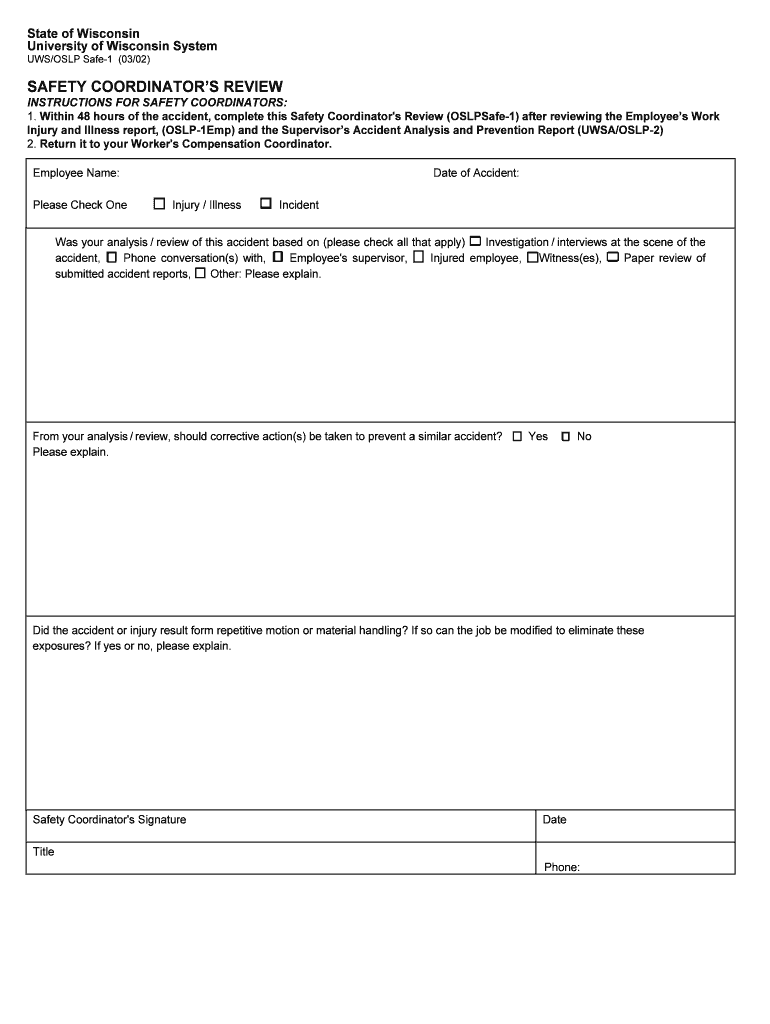 The Safety Coordinator's Review Form, known as the UWS/OSLP Safe-1, plays a critical role within the University of Wisconsin System by assisting in the review and analysis of workplace accidents. This document is essential for systematic evaluation, allowing safety coordinators to gather crucial data about incidents. Timely submission, ideally within 48 hours, is vital for effective incident management and subsequent safety improvements. It serves as a foundation for analyzing workplace incidents through structured documentation.
