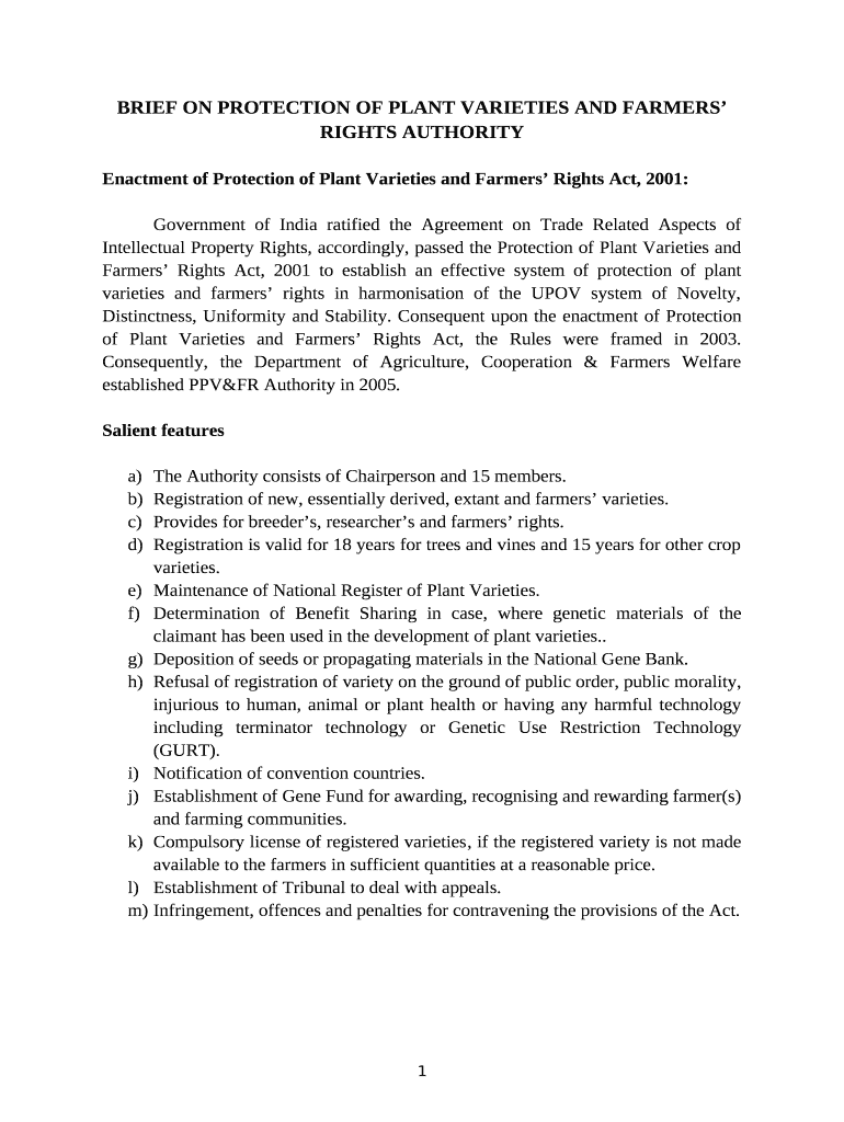 Get the free BRIEF ON PROTECTION OF PLANT VARIETIES AND FARMERS RIGHTS AUTHORITY template