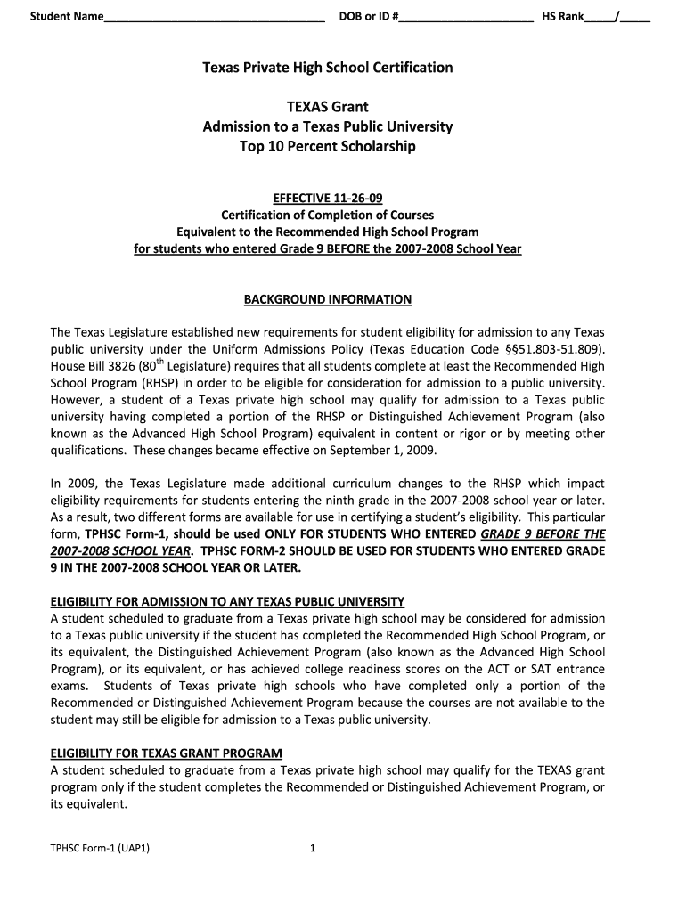 Completing this form is crucial for ensuring the student's admission eligibility to Texas public universities, particularly in qualifying for specific scholarships and grants.