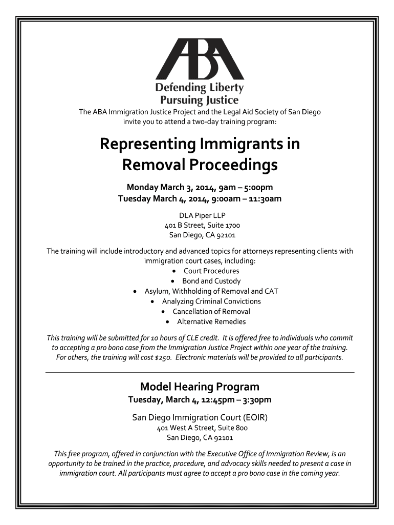 The ABA Immigration Justice Project and the Legal Aid Society of San Diego invite you to attend a today training program: Representing Immigrants in Removal Proceedings Monday, March 3, 2014, 9am