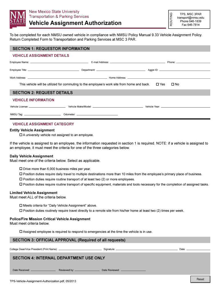 Get the free BVehicleb Assignment Authorization - New Mexico State University - af nmsu