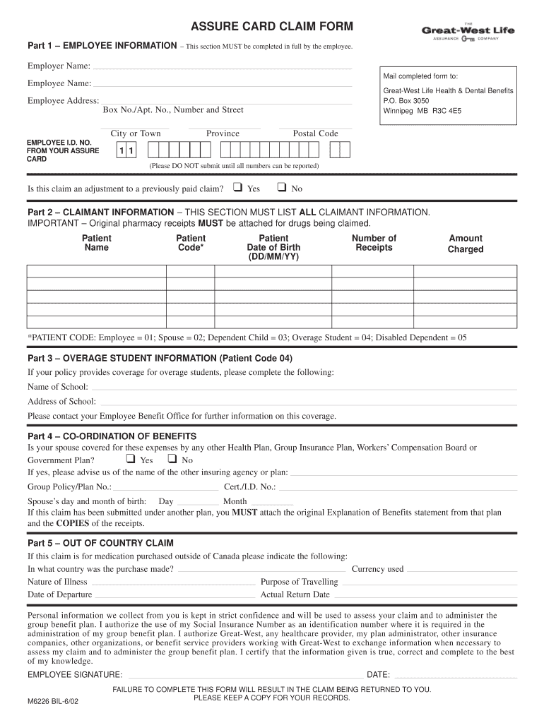 The Assure Card Claim Form is designed for employees covered by Great-West Life health insurance, including those filing claims for themselves or dependents.