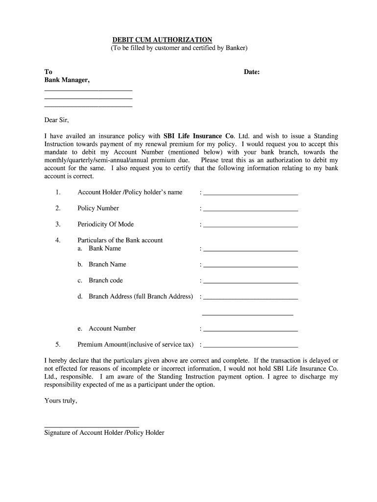 The Debit Authorization for Insurance Premium includes several user-friendly features. It contains fillable fields that allow users to input necessary details, providing flexibility in completing the form. Additionally, the document requires a signature and certification by the bank, enhancing its legitimacy.