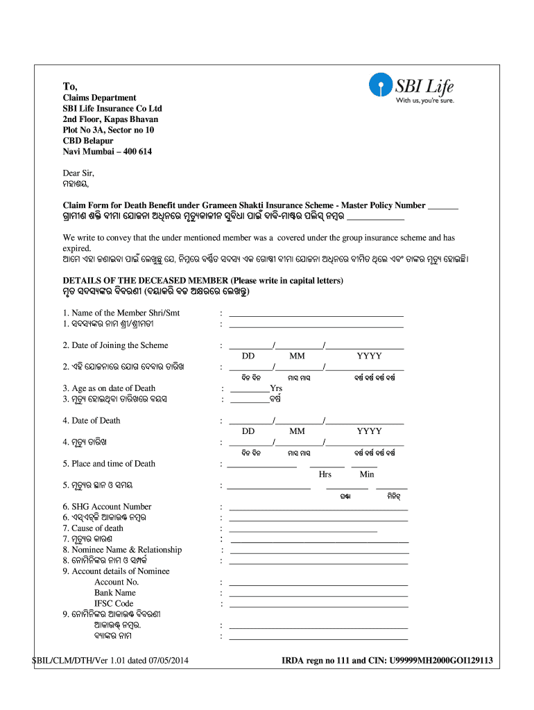 To, Claims Department SBI Life Insurance Co Ltd 2nd Floor, Keypad Haven Plot No 3A, Sector no 10 CBD Belarus Navi Mumbai 400 614 Dear Sir, Claim Form for Death Benefit under Green Shakti Insurance