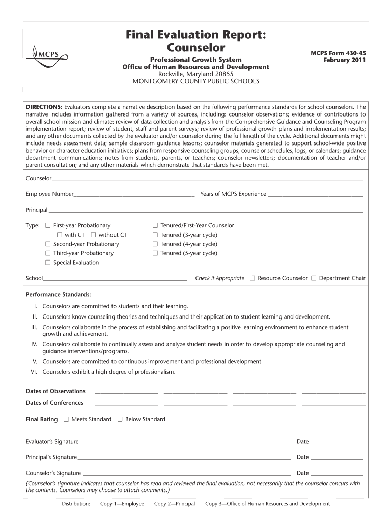 The MCPS Counselor Evaluation Form, specifically the MCPS Form 430-45, serves a crucial role in the evaluation process for counselors in Montgomery County Public Schools. This form is designed to assess school counselors by evaluating their performance against established standards. Its significance lies in providing a structured approach to counselor assessments, ultimately contributing to professional development and improving educational outcomes.