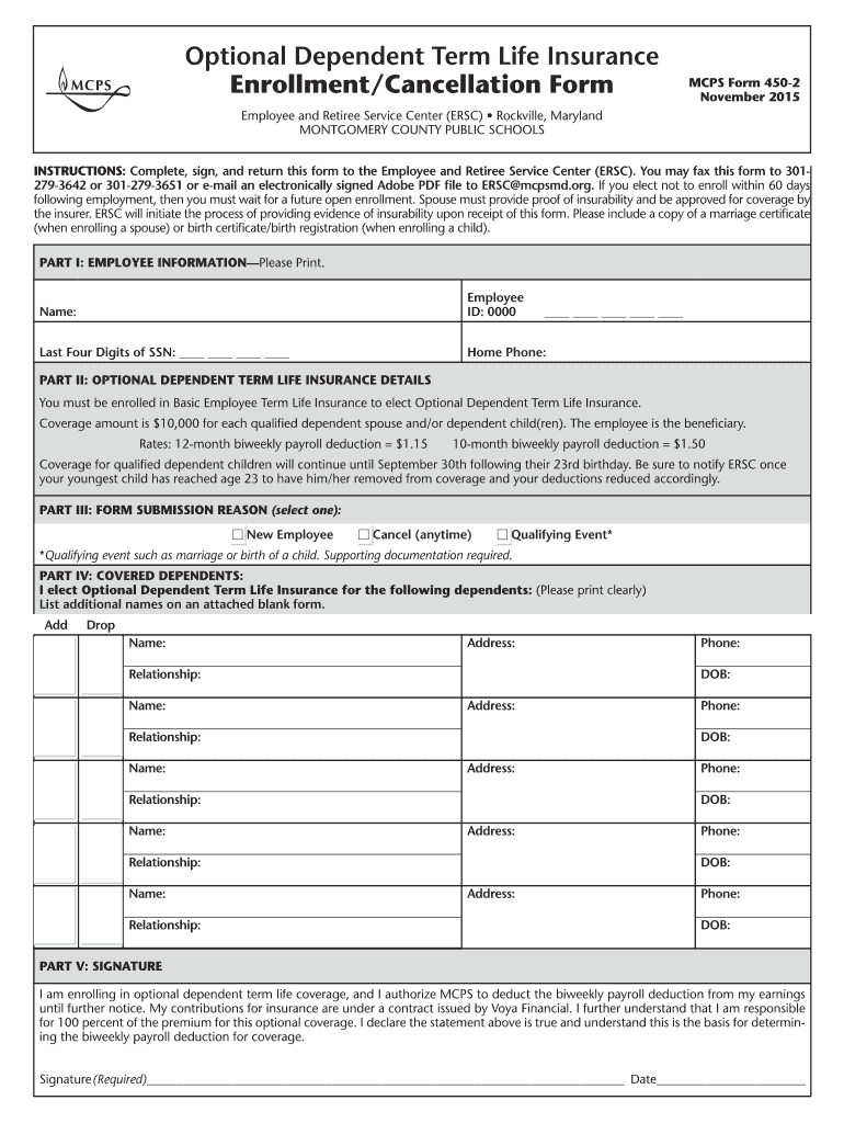 The Optional Dependent Term Life Insurance Enrollment/Cancellation Form, also known as MCPS Form 450-2, serves a critical function within the Montgomery County Public Schools (MCPS) system. This form allows employees to either enroll in or cancel optional dependent term life insurance coverage.