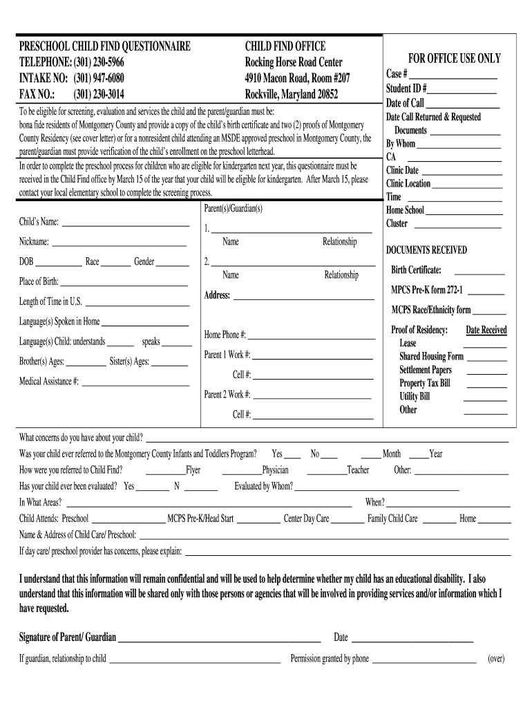 The Preschool Child Find Questionnaire should be filled out by parents or guardians of children who reside in Montgomery County, Maryland, and are approaching the age for kindergarten enrollment.