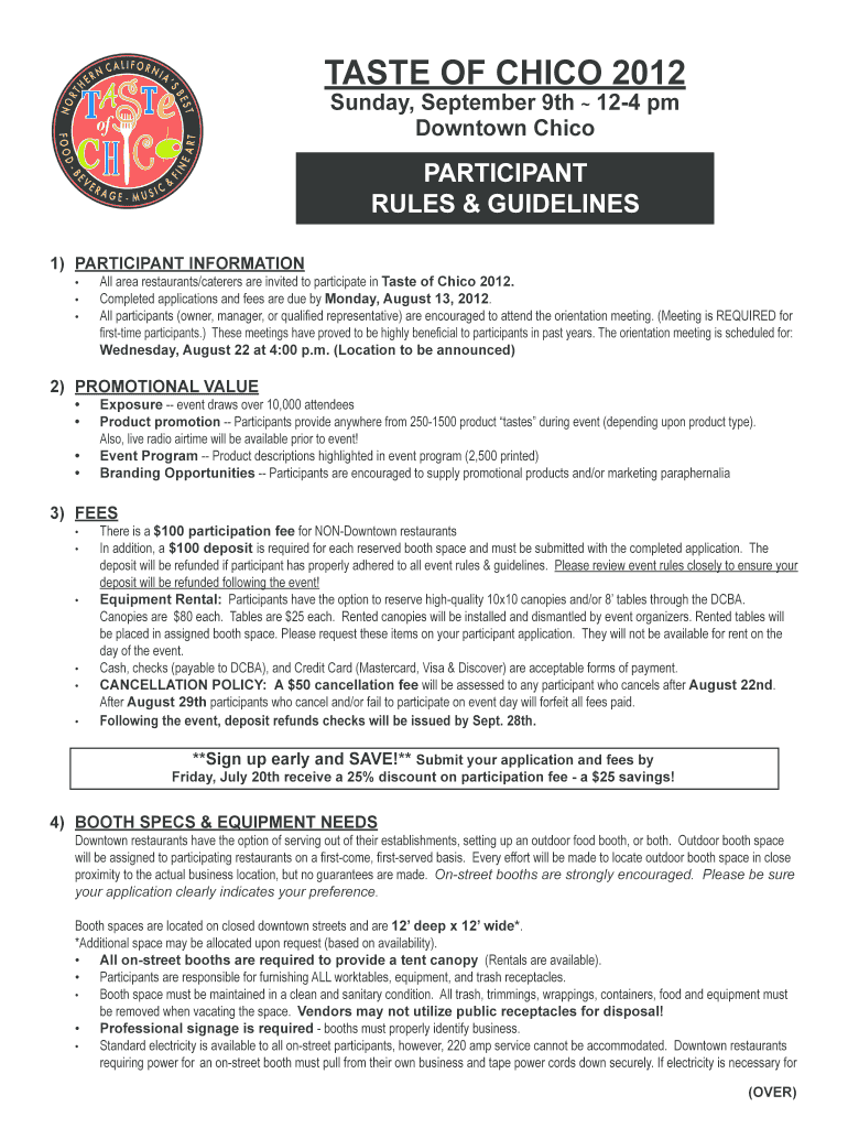 TASTE OF CHICO 2012 Sunday, September 9th 12-4 pm Downtown Chico PARTICIPANT RULES & GUIDELINES 1) PARTICIPANT INFORMATION All area restaurants/caterers are invited to participate in Taste of Chico