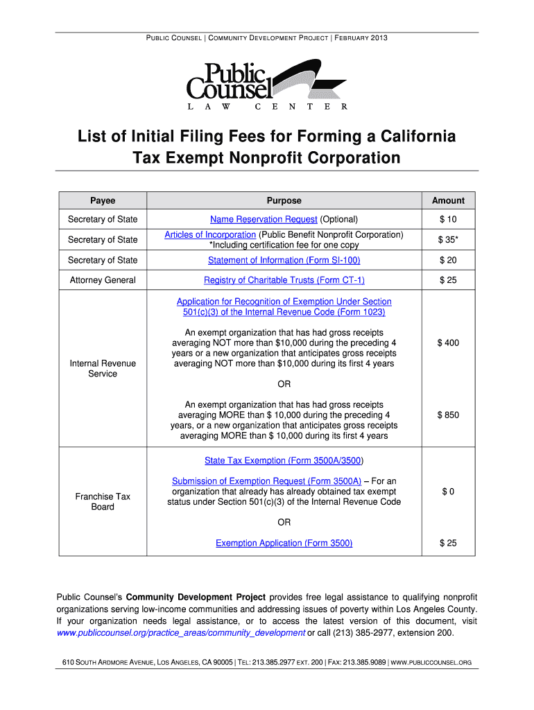 P PUBLIC C COUNSEL C COMMUNITY D DEVELOPMENT P PROJECT F FEBRUARY 2013List of Initial Filing Fees for Forming a California Tax Exempt Nonprofit Corporation PayeePurposeAmountSecretary of Statewide