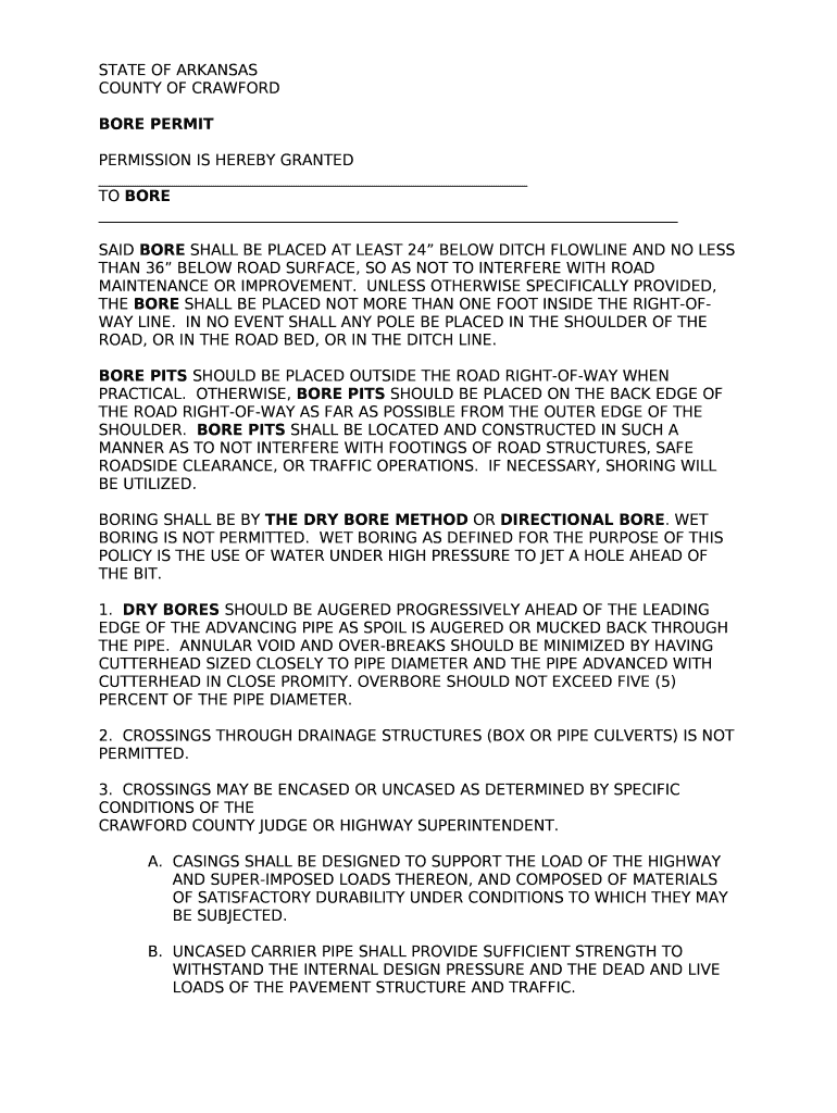 STATE OF ARKANSAS COUNTY OF CRAWFORDBORE PERMITPERMISSION IS HEREBY GRANTED TO BORE SAID BORE SHALL BE PLACED AT LEAST 24 BELOW DITCH FLOWING AND NO LESS THAN 36 BELOW ROAD SURFACE, SO AS NOT TO INTERFERE