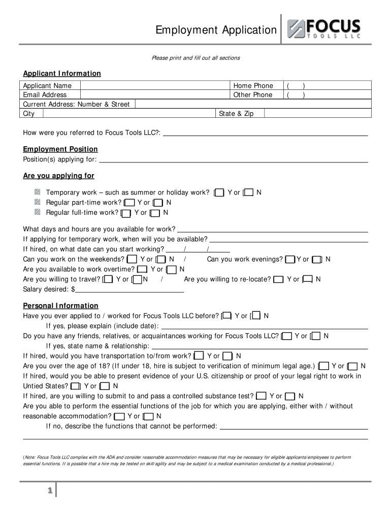The Employment Application Form is designed for individuals seeking employment at Focus Tools LLC. There are no specific eligibility requirements beyond the intention of applying for a job.
