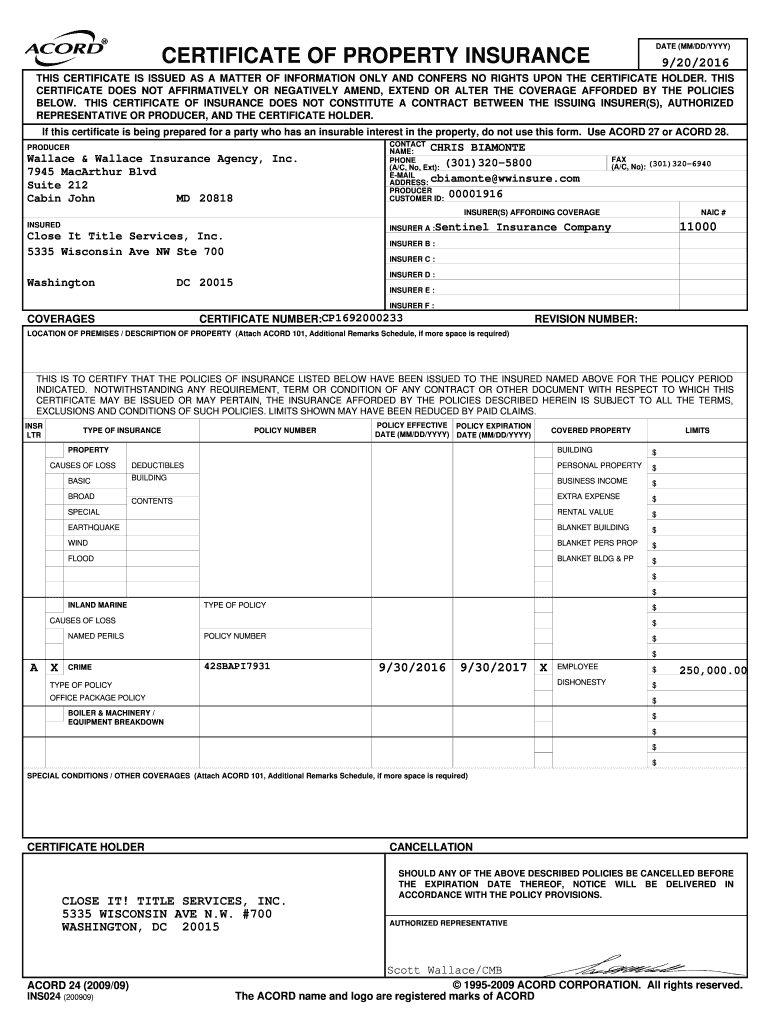 DATE (MM/DD/YYY)CERTIFICATE OF PROPERTY INSURANCE9/20/2016THIS CERTIFICATE IS ISSUED AS A MATTER OF INFORMATION ONLY AND CONFERS NO RIGHTS UPON THE CERTIFICATE HOLDER. THIS CERTIFICATE DOES NOT AFFIRMATIVELY