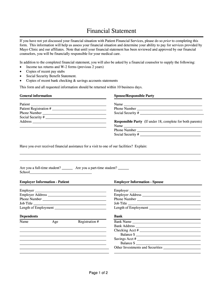 The Mayo Clinic Financial Statement Form is a healthcare document used by patients to assess their financial situation for medical billing purposes.