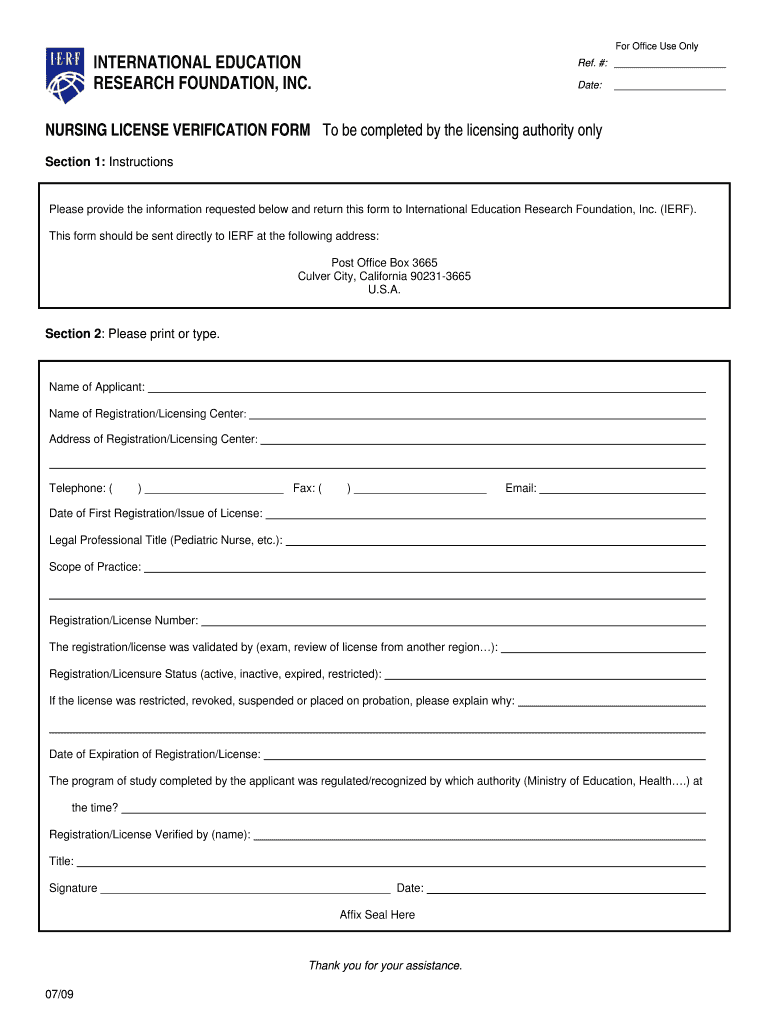 For Office Use Only INTERNATIONAL EDUCATION RESEARCH FOUNDATION, INC. Ref. #: Date: NURSING LICENSE VERIFICATION FORM To be completed by the licensing authority only Section 1: Instructions Please