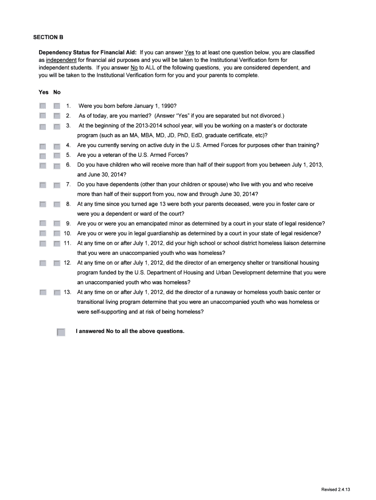 The 2013-2014 Institutional Verification Form is a financial aid document used by students to verify their dependency status and financial information for federal aid applications.