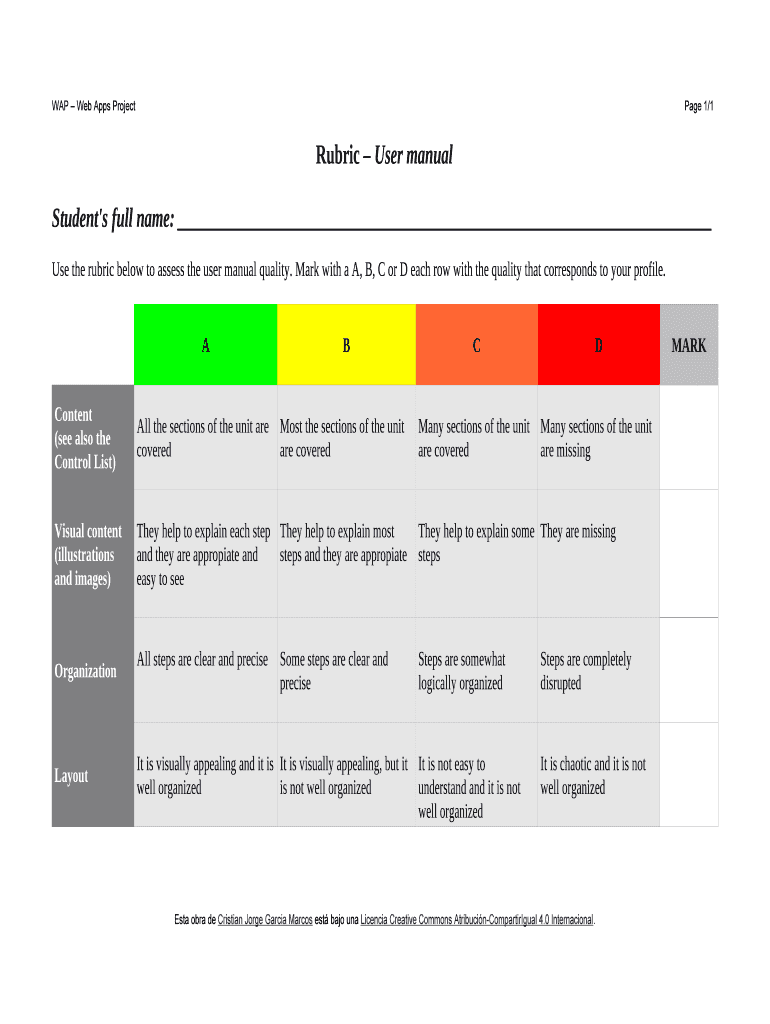 WAP Web Apps Project Page 1/1Rubric User manual Student's full name: Use the rubric below to assess the user manual quality. Mark with a, B, C or D each row with the quality that corresponds to your