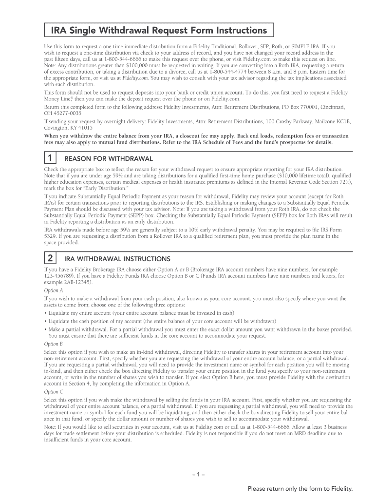The IRA Single Withdrawal Request Form can be used by individuals who are account holders of Fidelity IRAs, including Traditional, Rollover, SEP, Roth, or SIMPLE accounts.