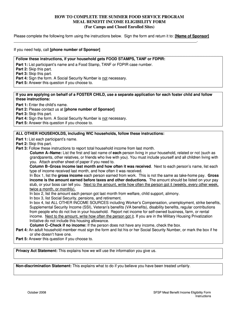 Get the free Summer Food Service Program Meal Benefit Income Eligibility Form