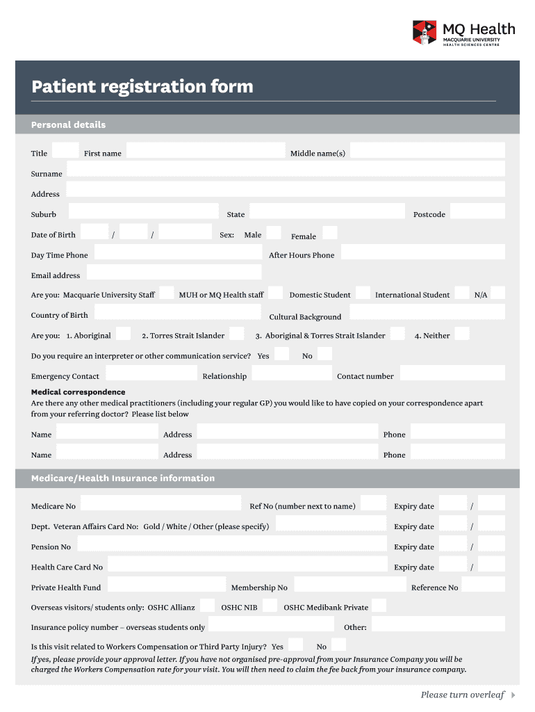 Patient registration form Personal details Titlist nameMiddle name(s)SurnameAddress Suburban of Birthrate //Sex:PostcodeMaleDay Time PhoneFemale After Hours Phonemic address Are you: Macquarie University