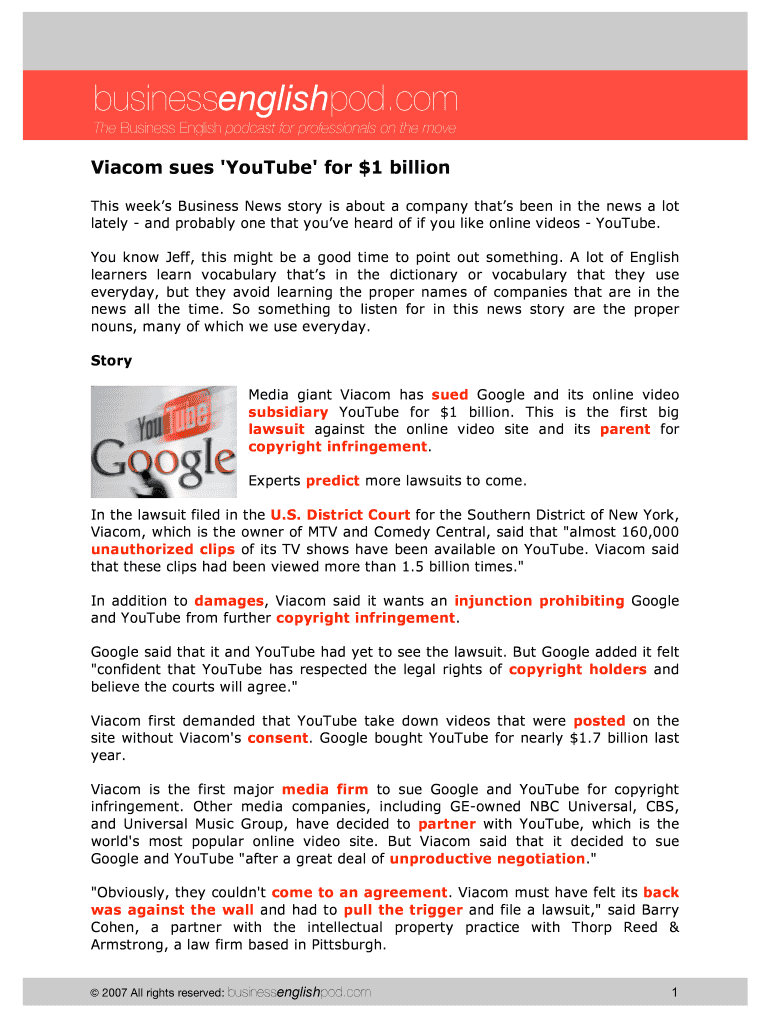 Businessenglishpod.com The Business English podcast for professionals on the move Viacom sues 'YouTube for $1 billion This week's Business News story is about a company that's been in the news a lot