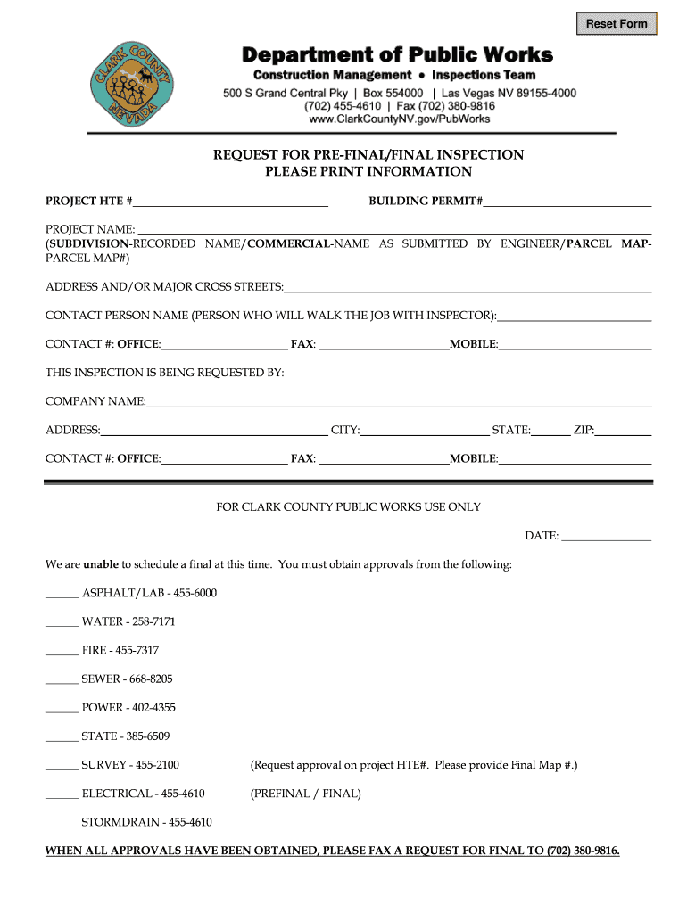 Reset Form REQUEST FOR PRE-FINAL/FINAL INSPECTION PLEASE PRINT INFORMATION BUILDING PERMIT# PROJECT HE # PROJECT NAME: (SUBDIVISION-RECORDED NAME/COMMERCIAL-NAME AS SUBMITTED BY ENGINEER/PARCEL APPAREL