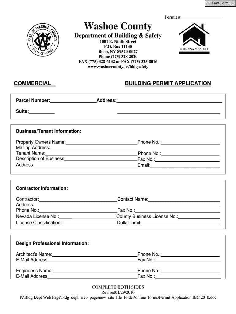 The Commercial Building Permit Application is a government form used by applicants to request permission for constructing or modifying commercial buildings in Washoe County, Nevada.
