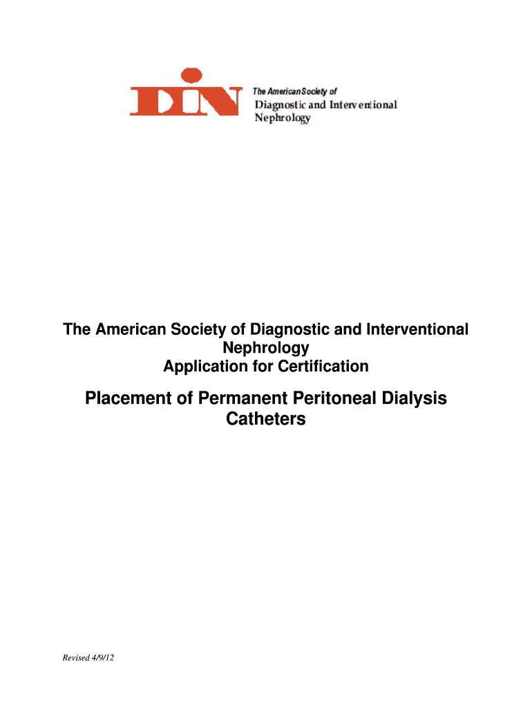The American Society of Diagnostic and Interventional Nephrology Application for Certification Placement of Permanent Peritoneal Dialysis Catheters Revised 4/9/12 The American Society of Diagnostic