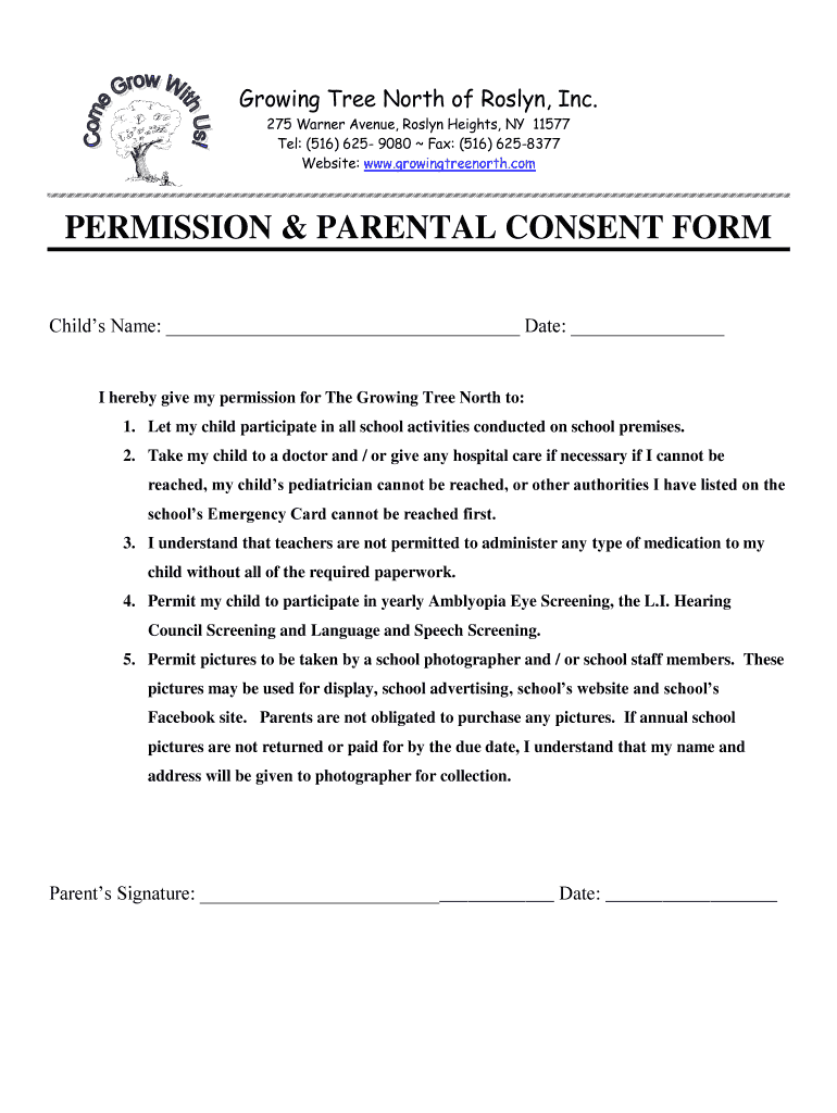 Growing Tree North of Roslyn, Inc. 275 Warner Avenue, Roslyn Heights, NY 11577 Tel: (516) 625 9080 Fax: (516) 6258377 Website: www.growingtreenorth.comPERMISSION & PARENTAL CONSENT FORM Child's Name: