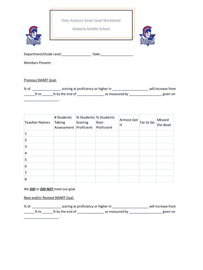 The Data Analysis Smart Goal Worksheet is a crucial tool for educators focused on tracking student performance. This worksheet facilitates educational goal setting by allowing teachers to define SMART goals—specific, measurable, achievable, relevant, and time-bound objectives that enhance student learning outcomes. It serves as a valuable resource for educational institutions to evaluate student progress and improve teaching strategies.