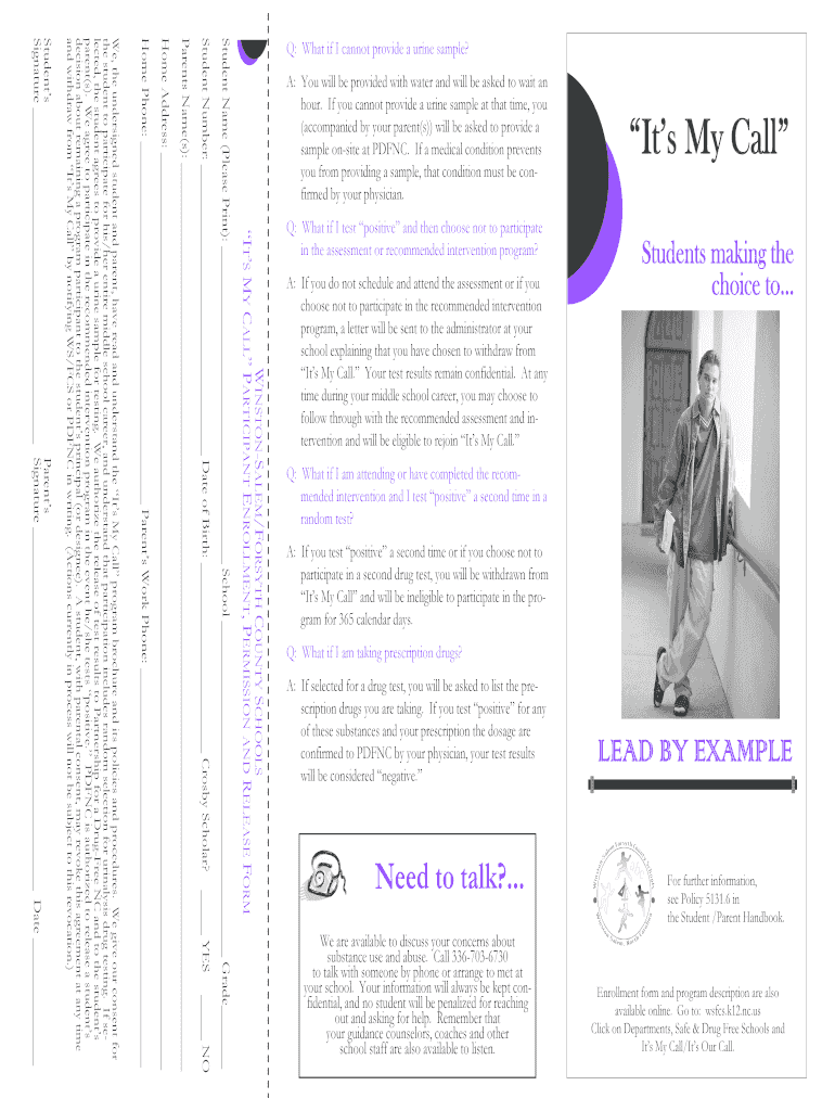 The It’s My Call Student Enrollment Form is a permission document used by middle school students in Winston-Salem to enroll in a drug testing program.