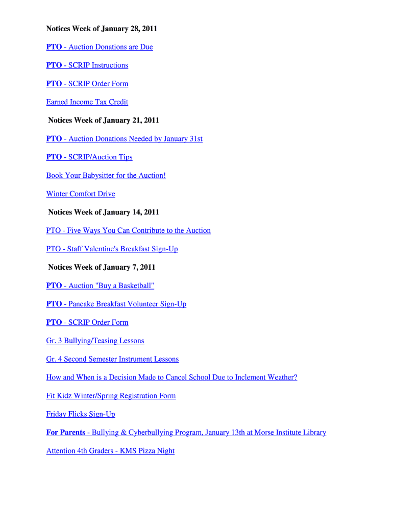 Notices Week of January 28, 2011, PTO Auction Donations are Due PTO — SCRIP Instructions PTO SCRIP Order Form Earned Income Tax Credit Notices Week of January 21, 2011, PTO Auction Donations Needed