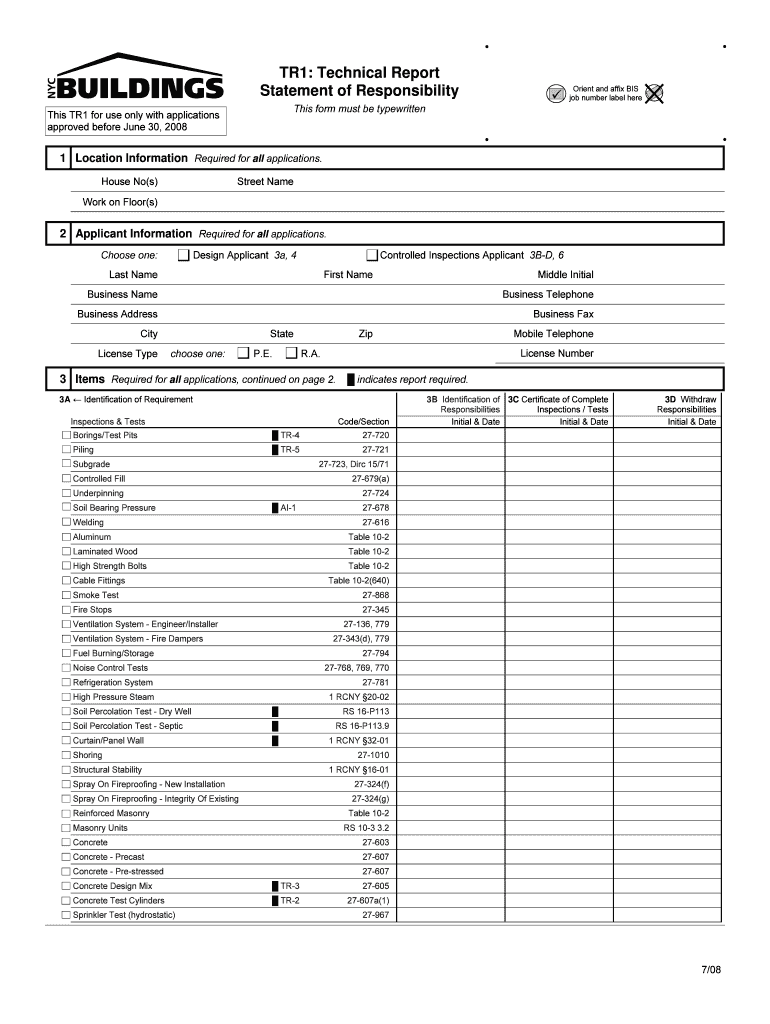 The TR1 Technical Report Form is a government document used by applicants in New York City to apply for construction and building work permits.