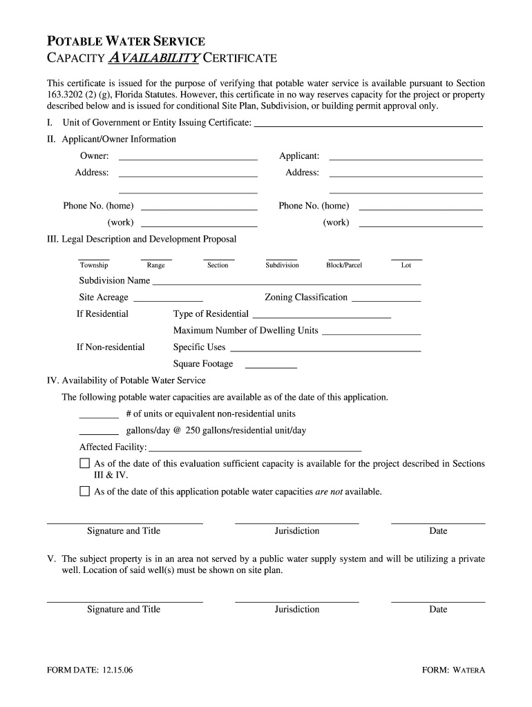 Get the free Florida Potable Water Service Capacity Certificate