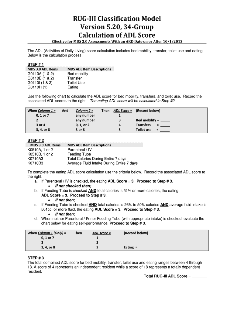The RUG-III ADL Score Calculation form plays a crucial role in assessing activities of daily living (ADL) among residents in healthcare settings. This assessment is fundamental for determining the level of care required by individuals, ensuring they receive appropriate and personalized healthcare services. The RUG-III ADL score connects directly to the MDS 3.0 assessments, which have been in effect for evaluations with an ARD date on or after 10/1/2013. Understanding this calculation is essential for effective patient care and rehabilitation strategies.