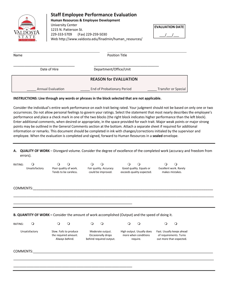 Supervisors at Valdosta State University are eligible to fill out this form to evaluate eligible staff members under their supervision.