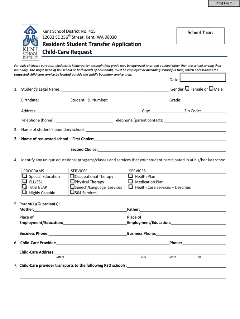 Print Form Kent School District No. 415 12033 SE 256th Street, Kent, WA 98030 School Year: Resident Student Transfer Application Child-Care Request For daily childcare purposes, students in kindergarten
