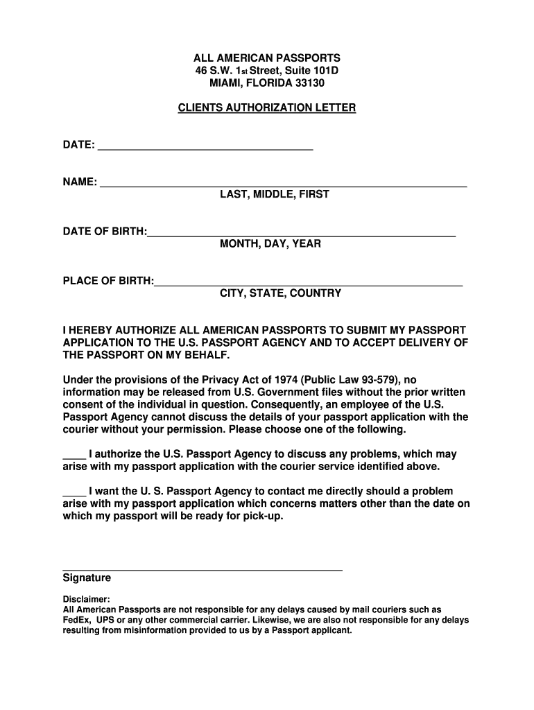 ALL AMERICAN PASSPORTS 46 S.W. 1st Street, Suite 101D MIAMI, FLORIDA 33130 CLIENTS AUTHORIZATION LETTER DATE: NAME: LAST, MIDDLE, FIRST DATE OF BIRTH: MONTH, DAY, YEAR PLACE OF BIRTH: CITY, STATE,