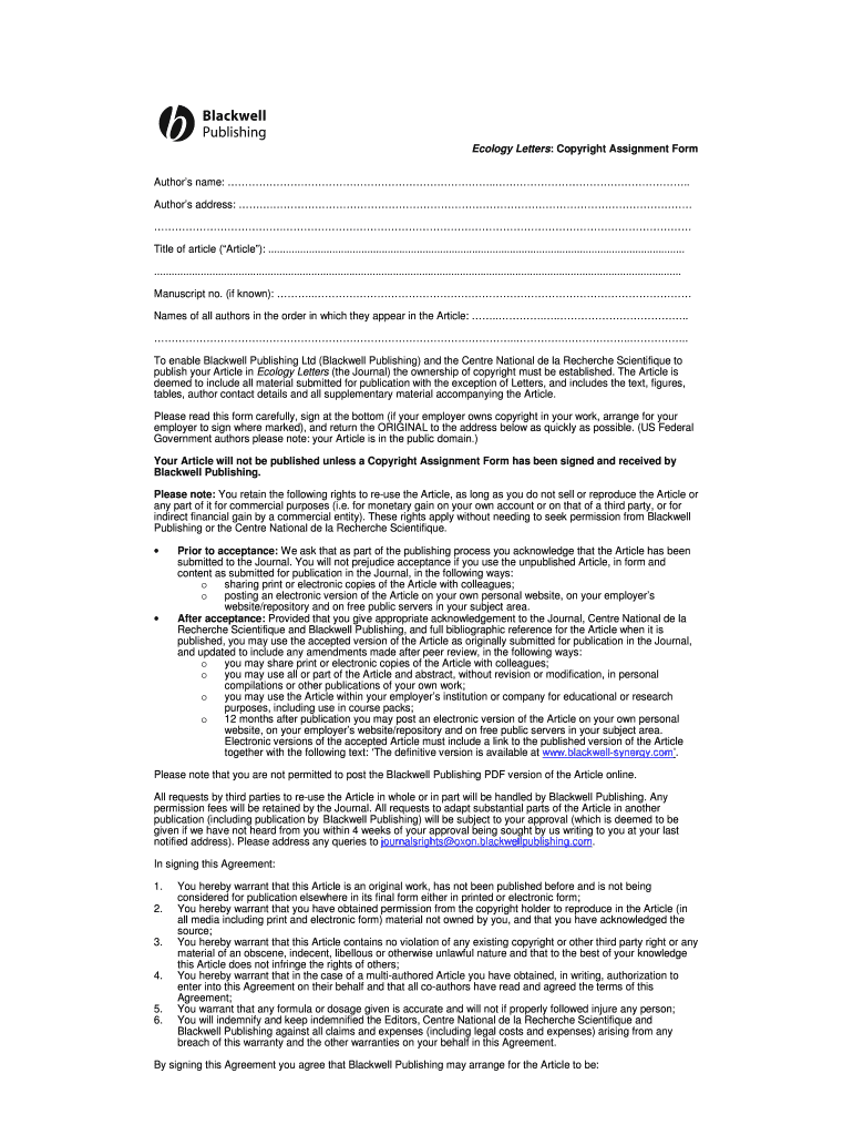 The Ecology Letters Copyright Assignment Form is a legal document used by authors to transfer copyright ownership of their articles to Blackwell Publishing and the Centre National de la Recherche Scientifique.