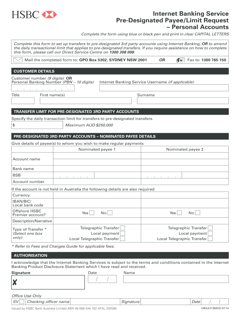 Eligibility for this form is limited to HSBC Bank Australia customers who wish to set or amend their daily transaction limits for transfers to designated third-party accounts.