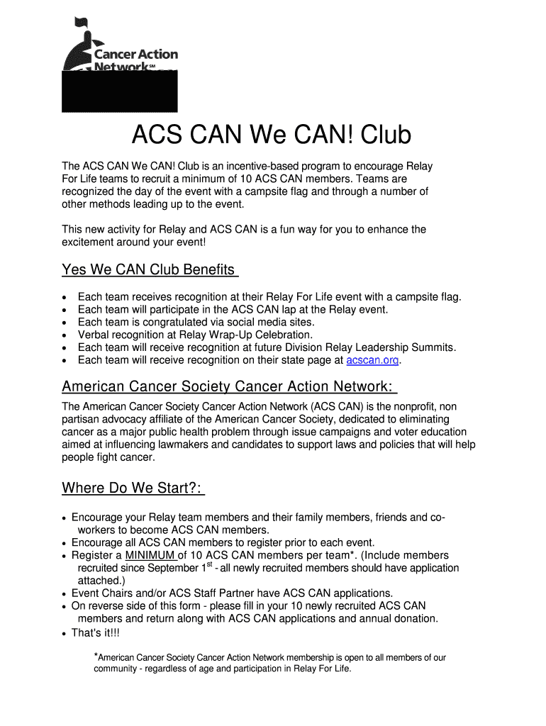 The ACS CAN We CAN! Club Application is a personal form used by Relay For Life teams to recruit a minimum of 10 ACS CAN members for membership recognition.