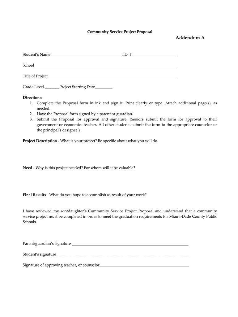 High school students enrolled in Miami-Dade County Public Schools are eligible to complete this proposal form as part of their community service graduation requirement.