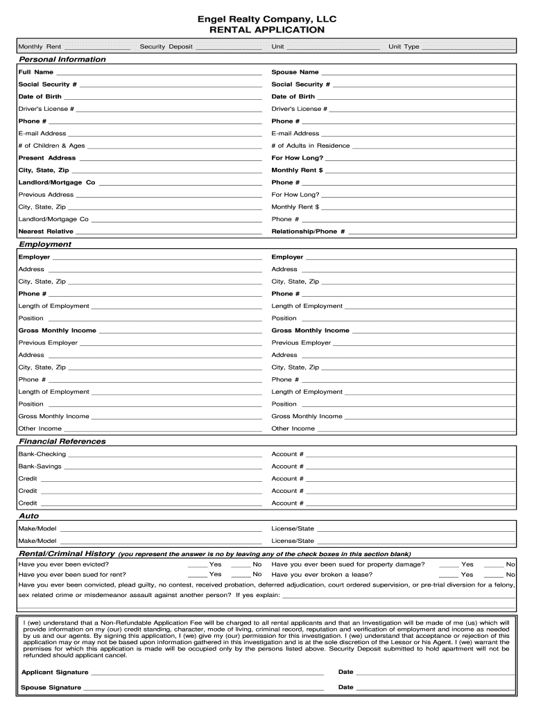 The Engel Realty Rental Application is a rental application form used by prospective tenants to apply for rental properties managed by Engel Realty Company, LLC.