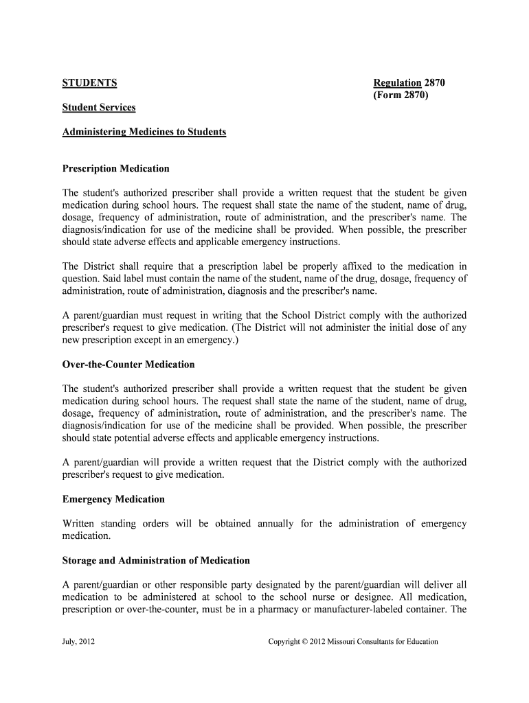 STUDENTS Regulation 2870 (Form 2870) Student Services Administering Medicines to Students Prescription Medication The student's authorized prescriber shall provide a written request that the student