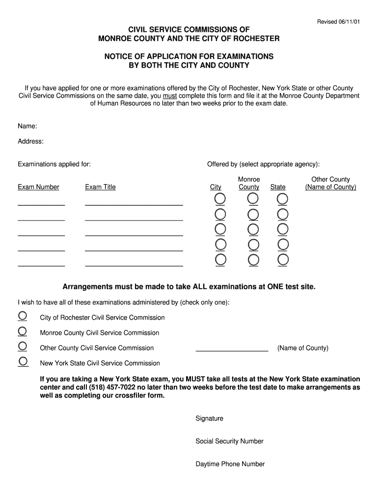 Revised 06/11/01 CIVIL SERVICE COMMISSIONS OF MONROE COUNTY AND THE CITY OF ROCHESTER NOTICE OF APPLICATION FOR EXAMINATIONS BY BOTH THE CITY AND COUNTY If you have applied for one or more examinations
