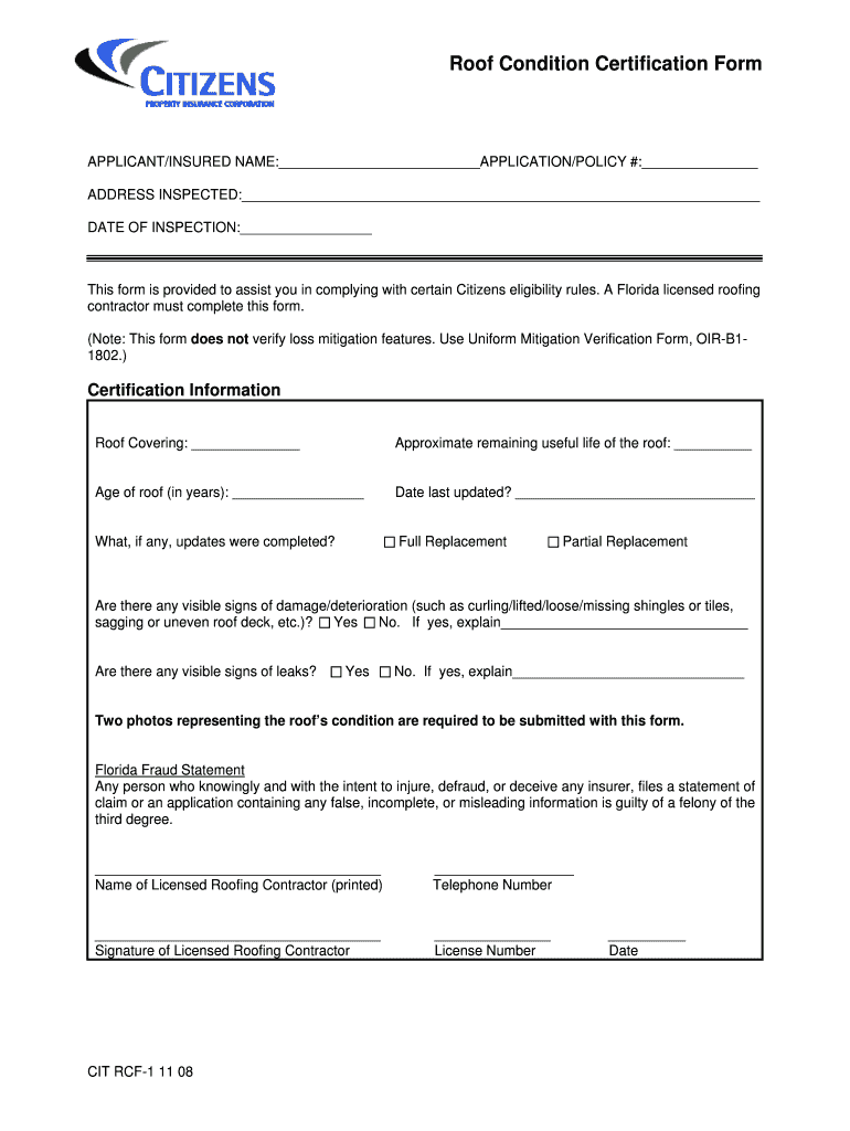 Roof Condition Certification Form APPLICANT/INSURED NAME: APPLICATION/POLICY #: ADDRESS INSPECTED: DATE OF INSPECTION: This form is provided to assist you in complying with certain Citizens' eligibility