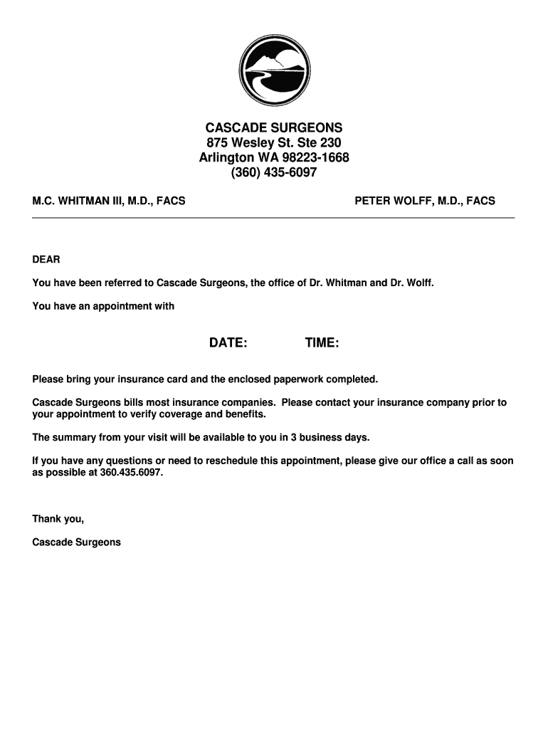 CASCADE SURGEONS 875 Wesley St. Ste 230 Arlington WA 982231668 (360) 4356097 M.C. WHITMAN III, M.D., FASTER WOLFF, M.D., FACS DEAR You have been referred to Cascade Surgeons, the office of Dr. Whitman